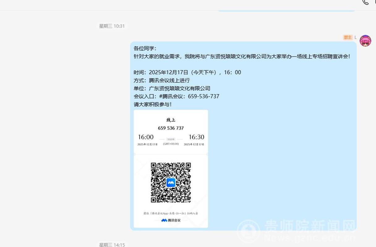 为拓宽毕业生就业渠道,加强校际合作与校企联动,文学与传媒学院于2025年10月至12月期间,先后与贵阳市观山湖区普瑞学校、兴仁市树德学校、广东贤悦琅琅文化有限公司等3家单位合作,共同组织了5场线上线下相结合的专项招聘活动。活动涵盖企业宣讲、岗位介绍、互动问答、试讲面谈等多个环节,旨在为2025届及2026届毕业生搭建从校园实践到职场就业的有效衔接平台。